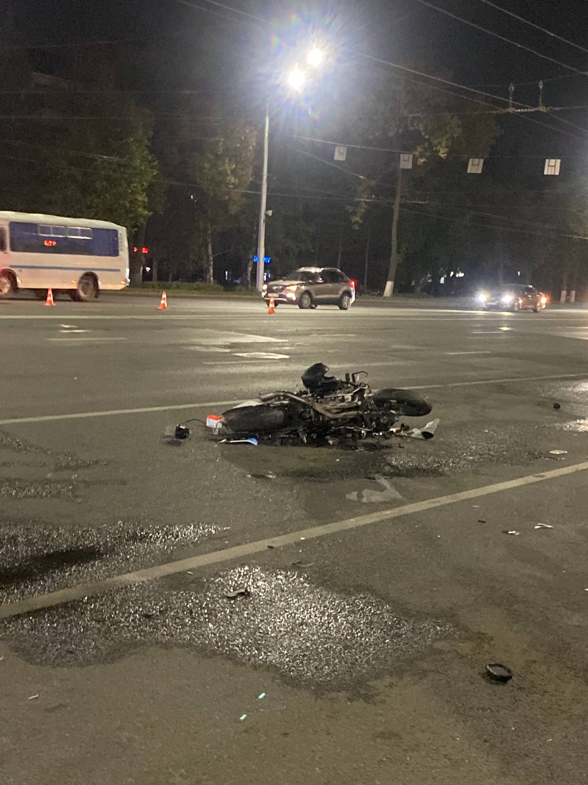 Мотоциклист, двигаясь по проспекту, сбил пожилого пешехода, который пытался перейти дорогу в неположенном месте. После удара мотоцикл угодил под автобус, но никто из пассажиров не пострадал.