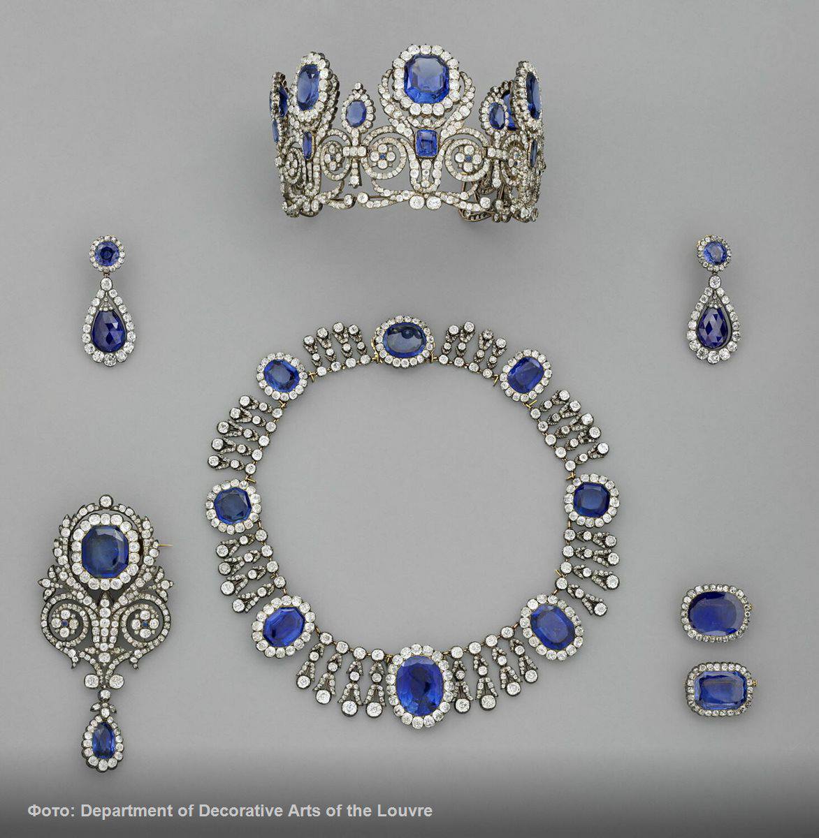 Диадема, ожерелье и серьги из сапфирового гарнитура королевы Марии-Амалии и Гортензии де Богарне. По семейному преданию, некоторые части этого ансамбля могли принадлежать Марии-Антуанетте. Украшение переходило из поколения в поколение по линии Орлеанского дома до 1985 года, когда было приобретено государством.