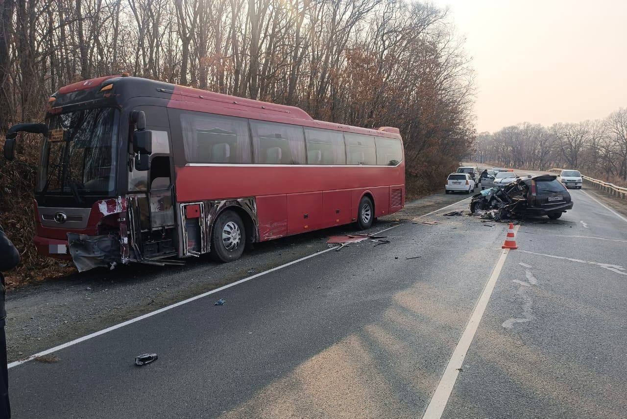 Сегодня утром под Артемом 60-летний водитель Toyota Carib, как сказано в сводке, "не справился с управлением на участке с мокрым асфальтовым покрытием" и врезался в рейсовый автобус на встречке (3 фото + 1 видео)